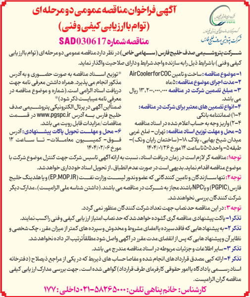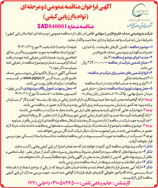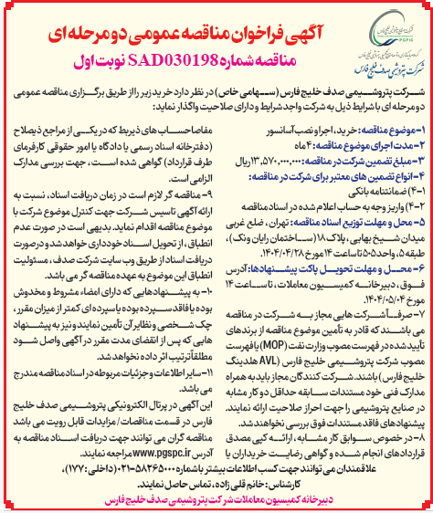 فراخوان مناقصه عمومی دو مرحله ای SAD030198