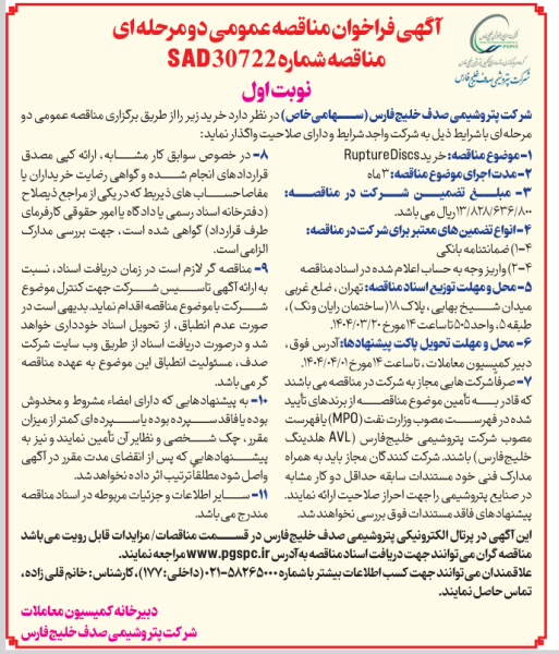 توجه: توزیع اسناد مناقصه SAD30722 به صورت حضوری و به آدرس مذکور در اسناد انجام می پذیرد. همراه داشتن معرفی نامه جهت دریافت اسناد الزامی است.